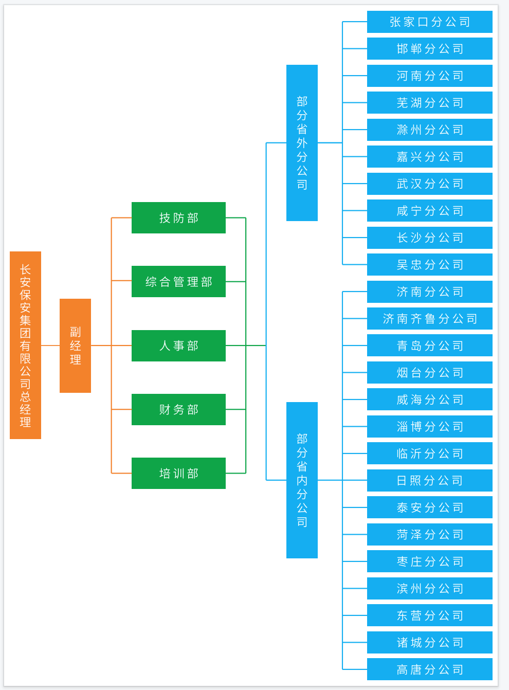 保安公司机构设置本着精干高效的原则,设经理室、副经理室。下设综合管理部、人事部、财务部、培训部、技防部等机构,保证了管理工作的顺利开展。